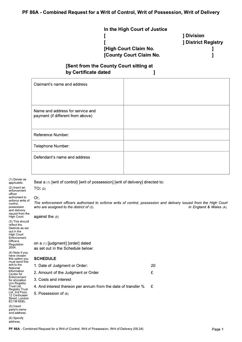 Combined Request for a Writ of Control, Writ of Possession, Writ of Delivery