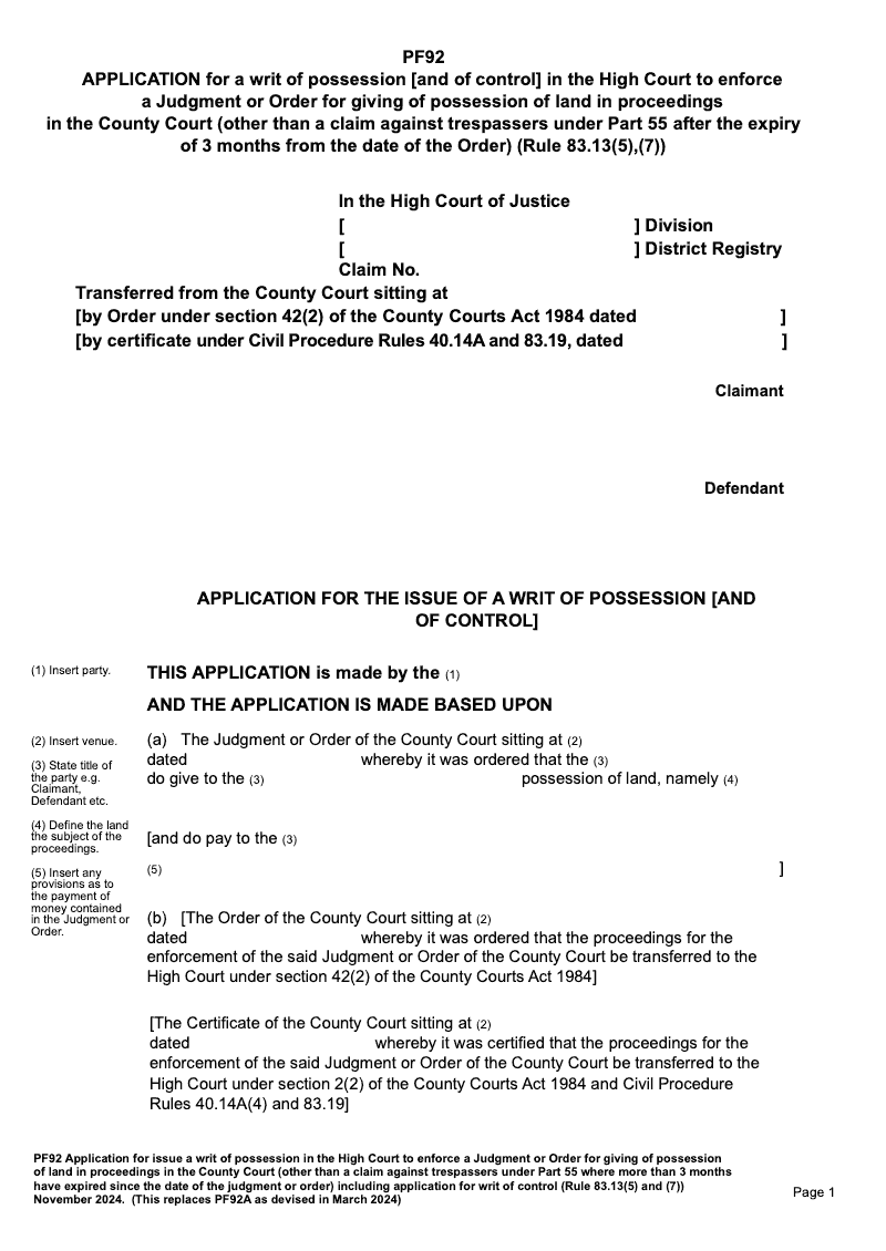 Application for a writ of possession [and of control] in the High Court to enforce a Judgment or Order for giving of possession of land in proceedings in the County Court (other than a claim against trespassers under Part 55 after the expiry of 3 months from the date of the Order) (Rule 83.13(5),(7))