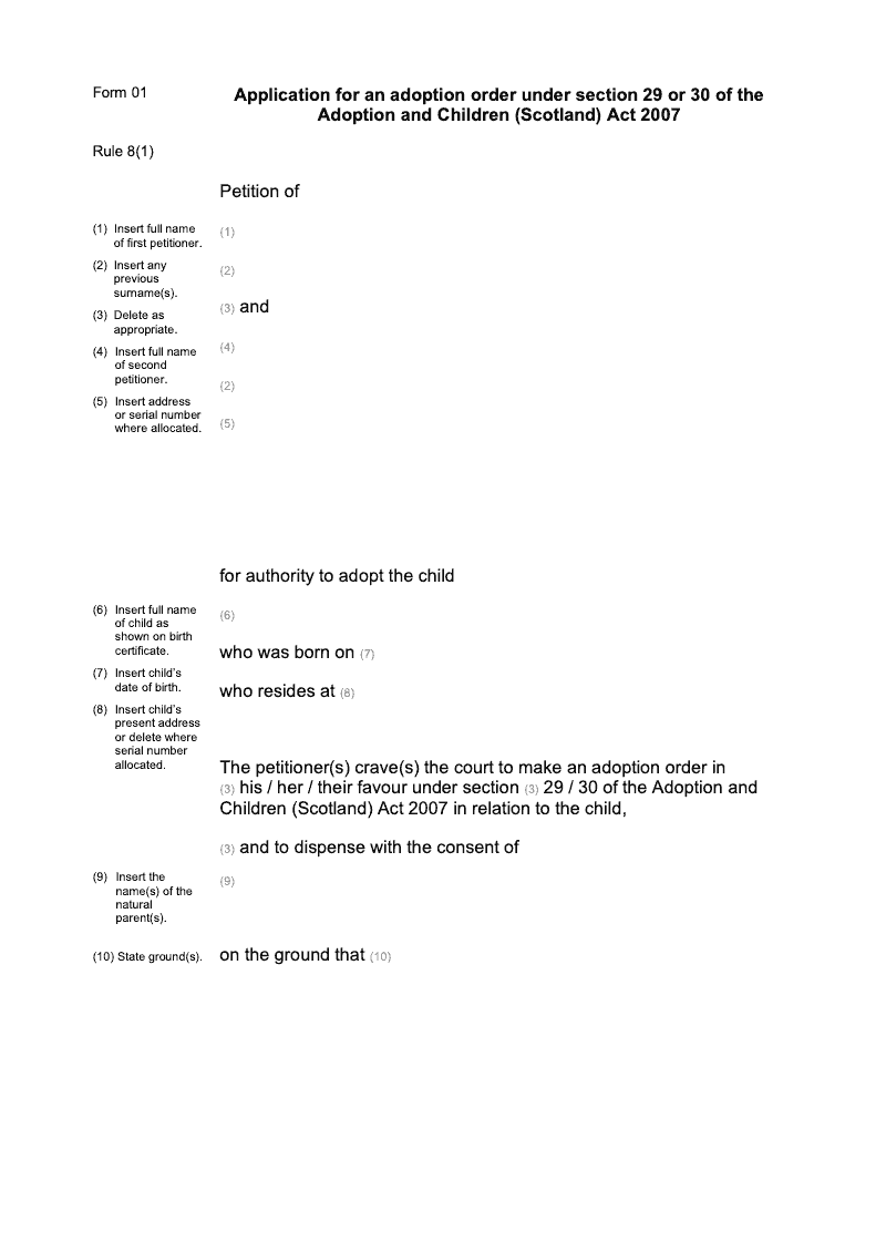Application for an adoption order under section 29 or 30 of the Adoption and Children (Scotland) Act 2007 - For use in application lodged on or after 28 September 2009 (Rule 8(1))