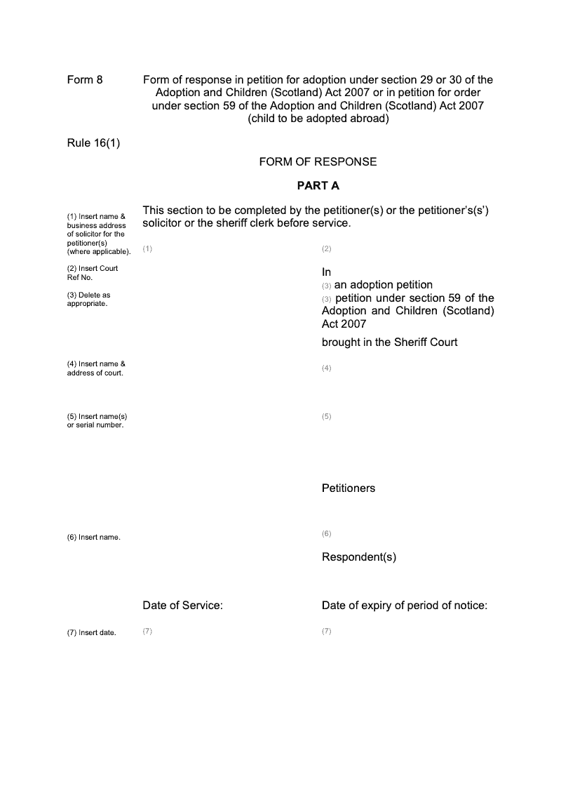 Form of response in petition for adoption under section 29 or 30 of the Adoption and Children (Scotland) Act 2007 or in petition for order under section 59 of the Adoption and Children (Scotland) Act 2007 (child to be adopted abroad) (Rule 16(1))
